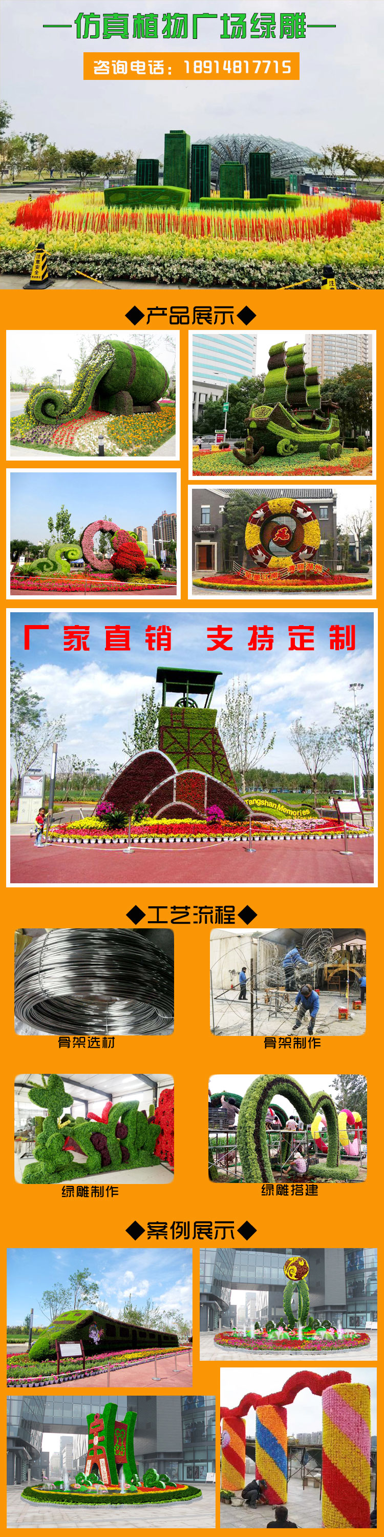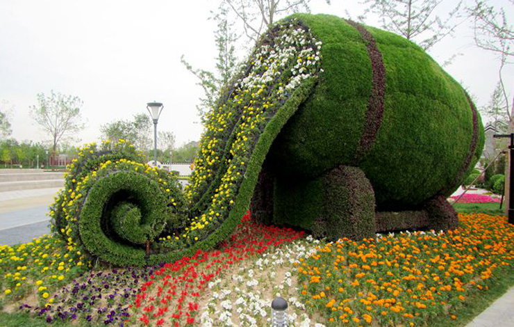 綠雕”被譽為世界園林藝術的奇葩,是一種有生命的植物雕塑。一般內設鋼材構架,然后在構架上填充栽培土,再于其上種植一年生或多年生小灌木或草本植物,即采用掛泥插草或卡盆工藝把不同顏色的花草覆蓋在結構造型的表面,巧妙地把雕塑造型與花卉園藝結合在一起,鋼架表面的植物覆蓋率至少要達到80%。因此,綠雕是充滿生機的“花卉雕塑”,是人類運用自然力量創造出的又一園藝文明。 特點: 1、造價低、性價比高 2、使用壽命長 3、無需維護 4、無地域、氣候限制 5、安裝移動方便 6、接受定制,造型多樣,細節逼真。 |